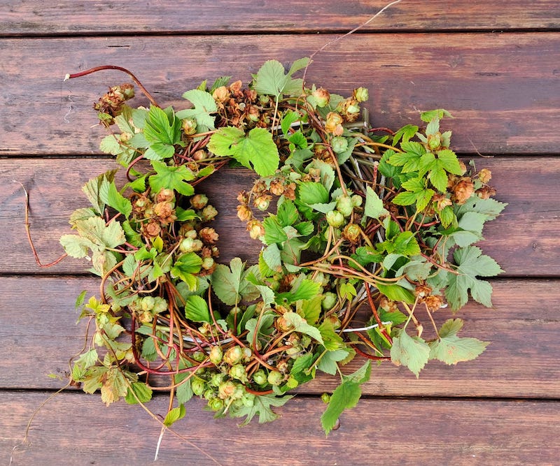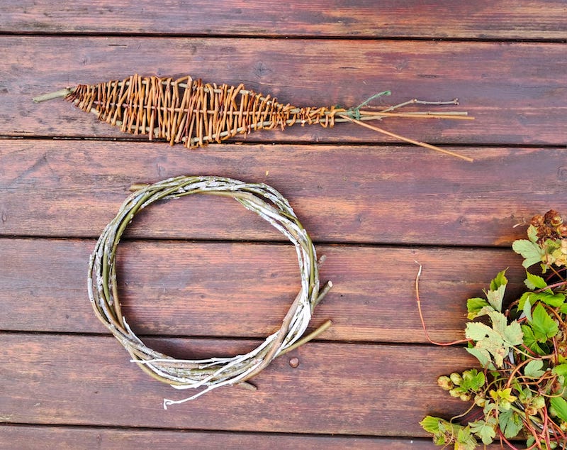 Trimmings from a white poplar sprouting in a hedge were used to make a wreath, followed by the same treatment for a goat willow. Hawthorn branches with thorns clipped off with pruning clippers were then used to make uprights, and hops vines woven around them using a twining technique.